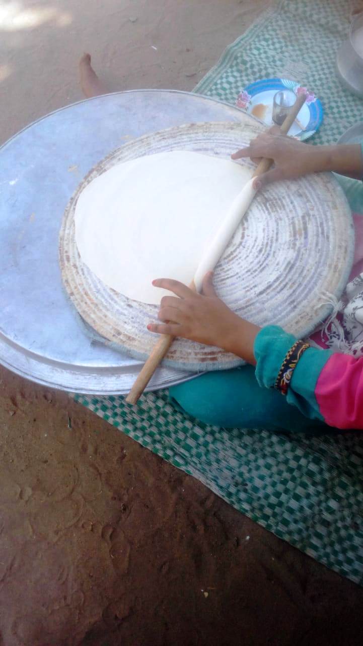 ويتم فرد العجينة على "الدوكة" وهى عبارة عن صاج حديدى دائرى الشكل، ويوضع تحته الطوب ليرتفع قليلاً عن النار، ويوضع حديثاً على المشعل مباشرة، ويضاف قليلاً من الزيت على الصاج حتى لا يلتصق الدقيق بالصاج، ثم يبدأ بوضع الدقيق المعجون بعد أن يصبح سائل على الدوكة بشكل دائرى يملأ الصاج تماماً، وبعد لحظات يتم رفعه ليصبح أشبه برقائق الفطير ويتم وضع كمية منها فى طبق رئيسى كبير وذات عمق كاف، لإضافة الملوخية الساخنة عليها وتقلب مع بعضها البعض، وتوضع على الطبق الرئيسى فى مائدة الإفطار ويمكن أكلها مع اللحم، ويوضع معها قليل من الملوخية مع وجود السلطات.